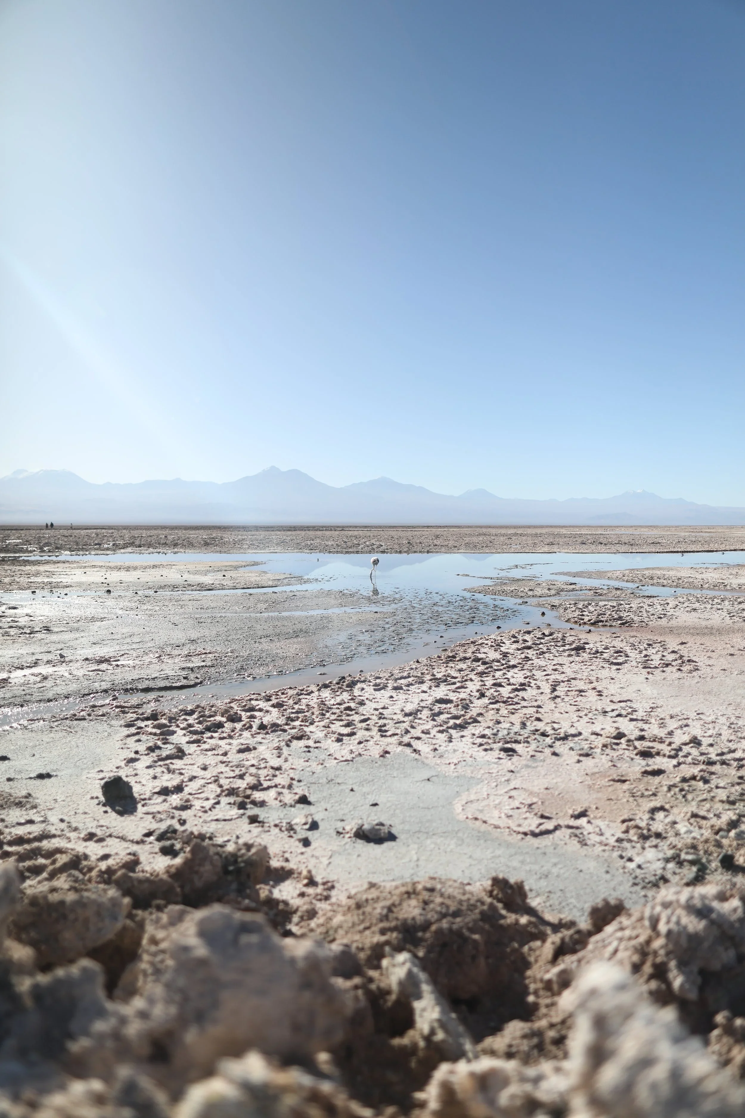 Satisfied and feeling more alive, our group loaded back into the van and headed an hour southwest to Laguna Chaxa. The Chaxa Lagoon is part of the Los Flamencos National Reserve and sits in the middle of Salar de Atacama. Salar de Atacama, the largest salt flat in Chile, is surrounded by mountains, lacking any drainage outlets. On the east, are the Andes Mountains, while on the west lies a mountain range called Cordillera de Domeyko. Several imposing volcanoes dominate the area, including Licancabur, Acamarachi, Aguas Calientes and Láscar, one of Chile’s most active volcanoes, last erupting in 2022.
