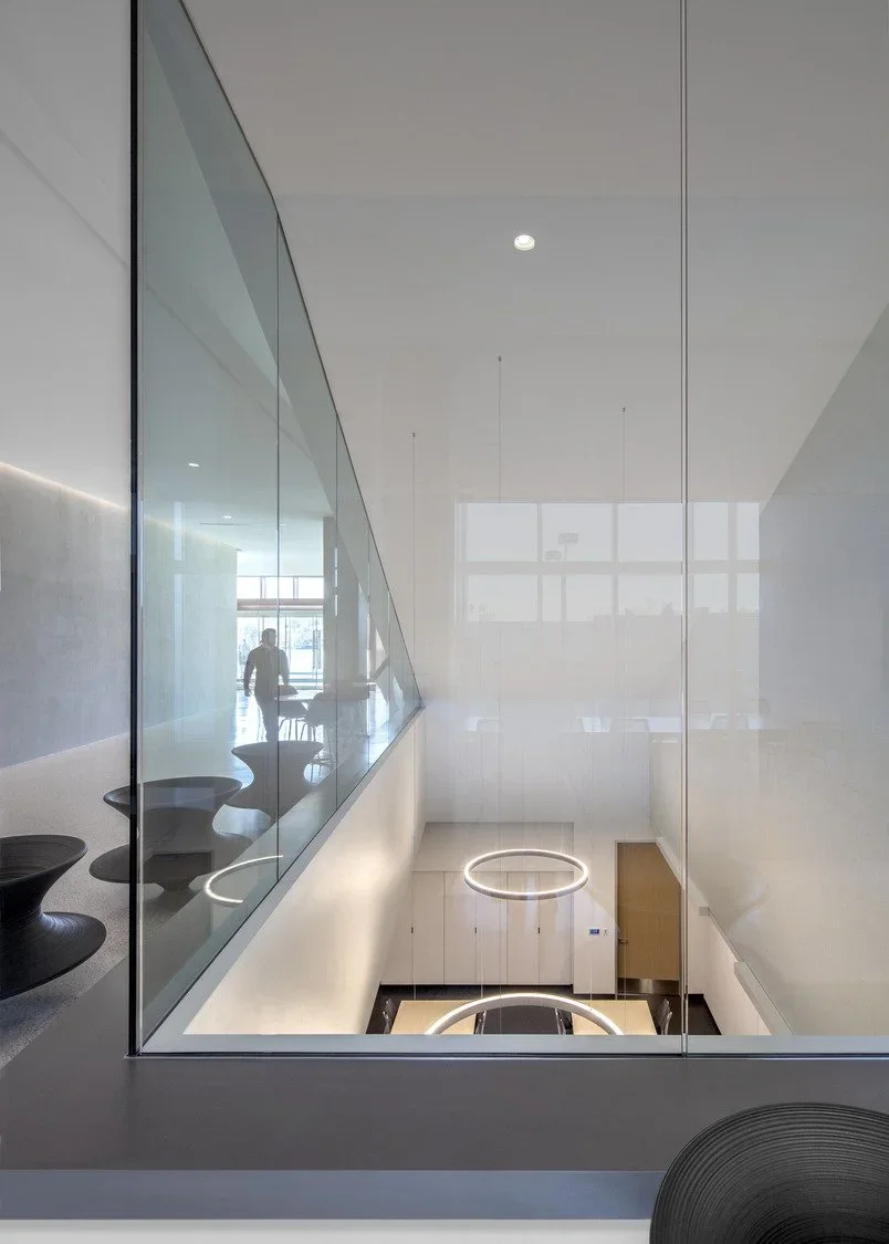 A dense office layout was combined with open, transparent work spaces, including rotating gallery walls. The overall palette was neutral to give way for a clean modern look that highlights artistic pops of color throughout.