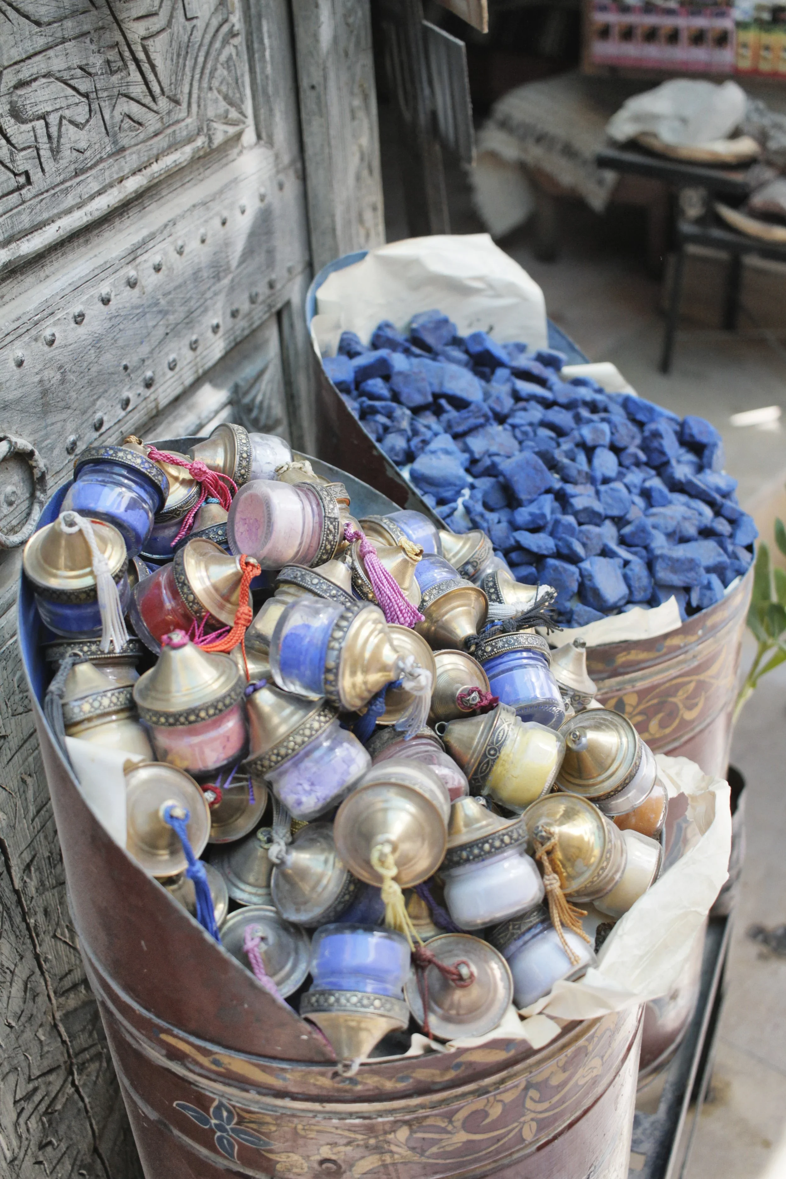 Shops spilled on to the dusty streets, hanging goods on stucco walls or stacking them neatly on wood platforms. Colorful blankets and textiles draped heavy, one after another, and carved brass objects shined with brilliance. Using natural dyes, I learned that brightly colored powders were used as makeup.